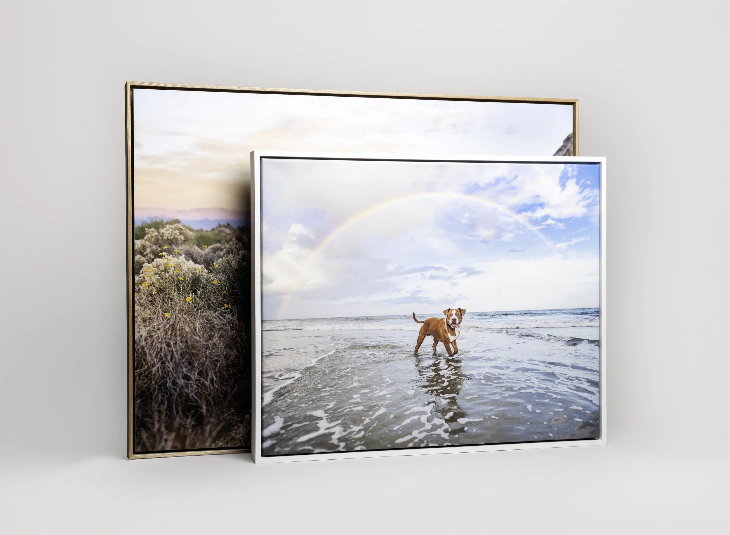 Our signature piece of art! These unique displays feature a 1/8” space between the frame and the print, creating a floating effect that adds stunning visual interest. Your image is printed on your choice of either lustre photographic paper or premium canvas and finished with a handcrafted classic, wood, or metal float frame. Tabletop version also available!